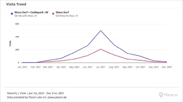 H&LA analyzed data from Placer, a location analytics company, that tracks venue traffic across the United States via cellphone data. The following charts highlight data from Placer for Waco Surf for 2021. The data highlights visitation in the surfing pool and at the overall property.